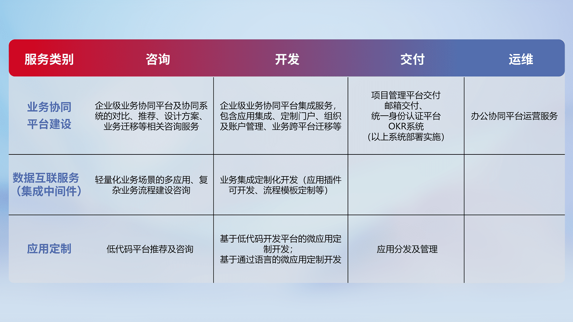 针对钉钉、、、企微、、、IDaas等平台级产品提供产品的规划、、、方案、、交付、、、、定制化开发等服务,,实现如统一协同办公、、、智能客户服务、、、、混合会议管理、、智能数据查询、、、等业务场景,,实现数字化转型。。。。
