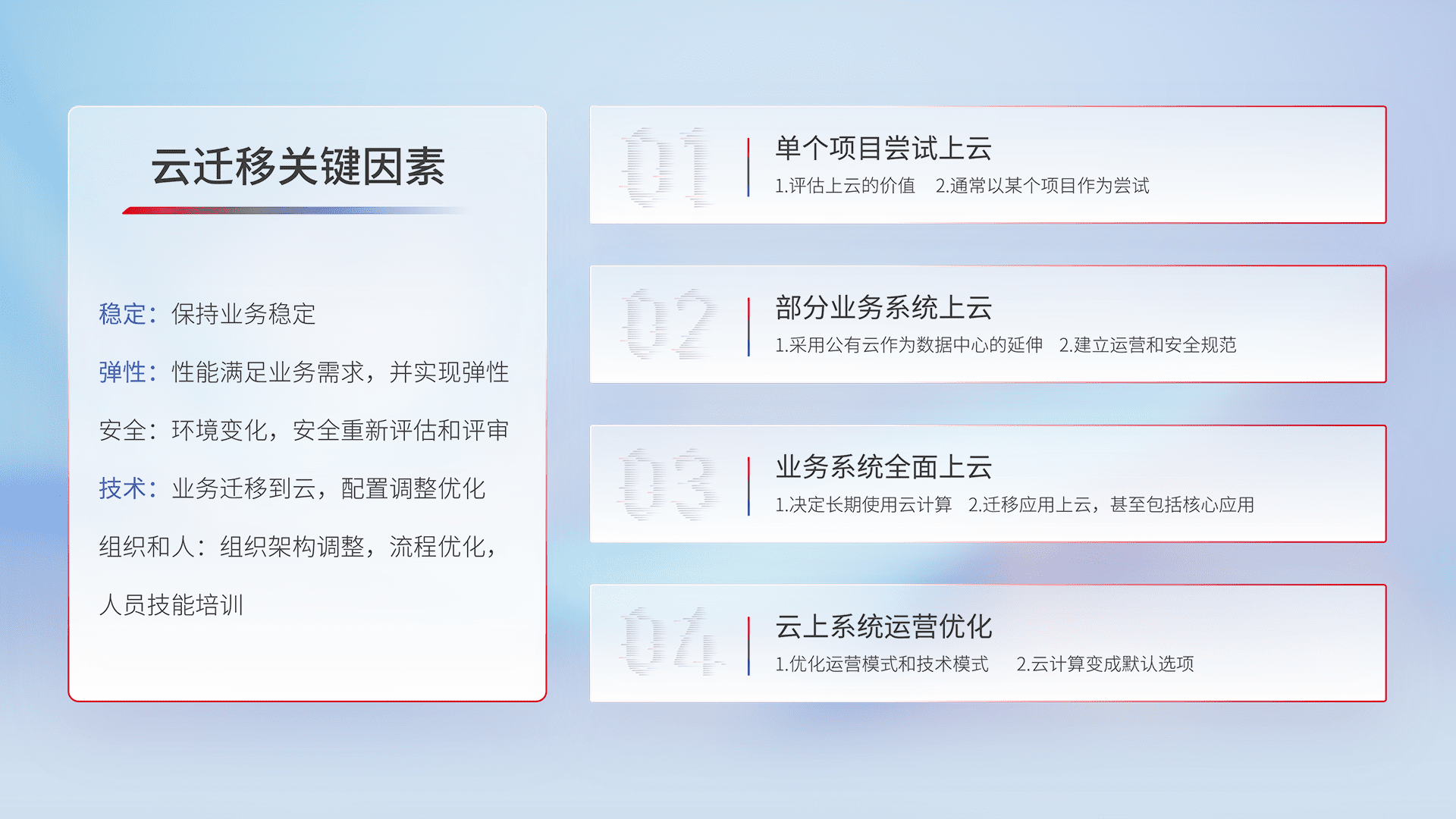 结合实际业务,,从规划设计、、云平台选型、、云原生改造、、数据迁移、、、、集成交付,,迁移全过程为客户识别最佳上云路径,,做好风险识别管理,,,设计网络架构、、、、身份权限、、、安全审计合规、、操作审计、、、、日志审计、、、、监控告警策略、、多站点容灾设计等,,对云上基础设施进行整体规划,,提升IT治理水平,,,以满足弹性、、、高可用、、高性能的需求。。。