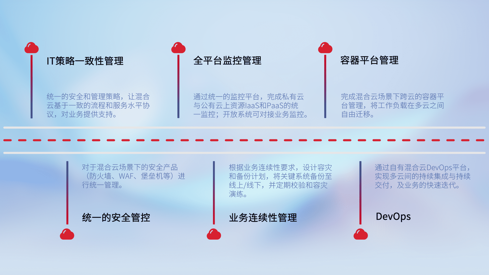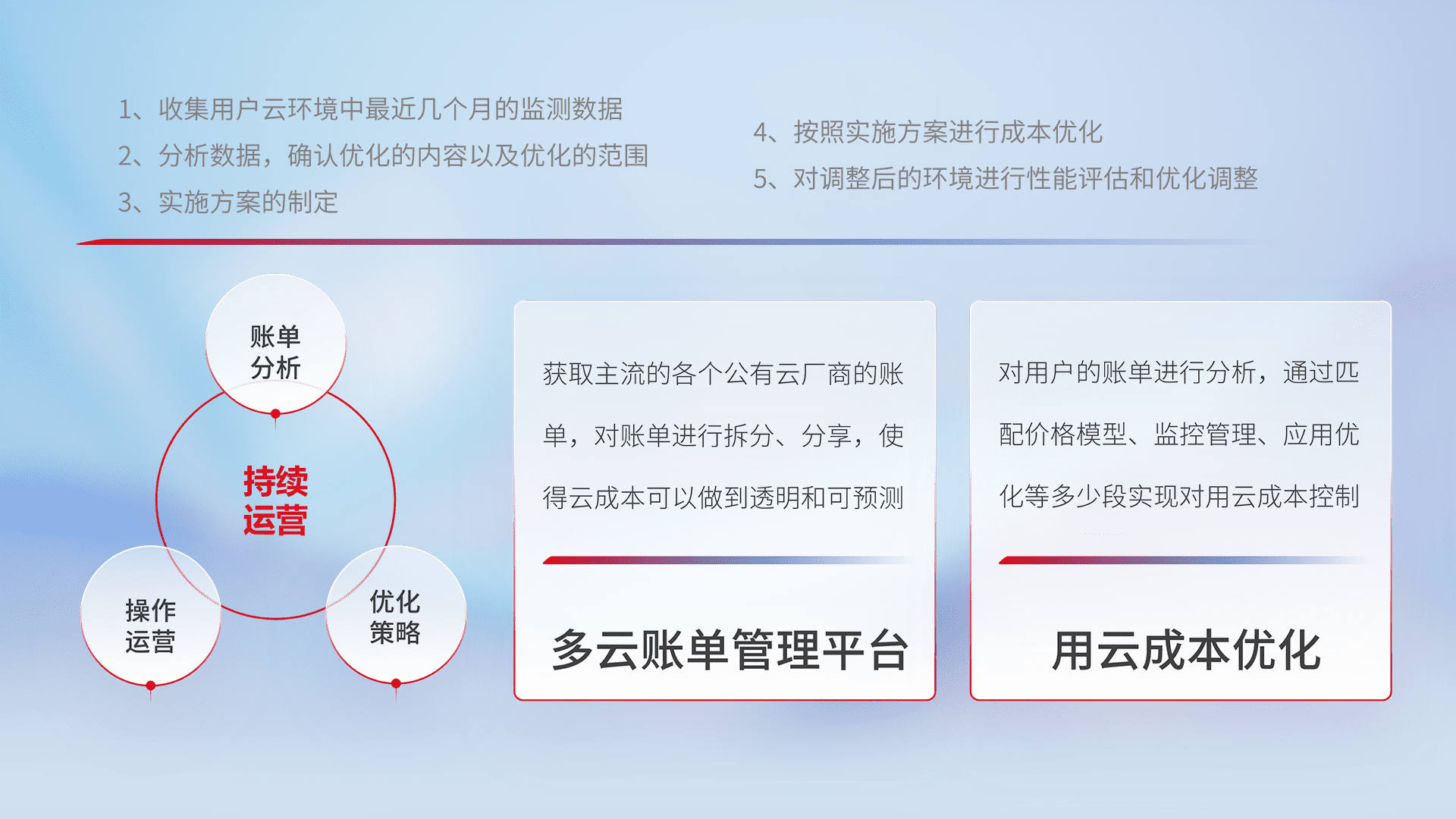 通过多云纳管,,,以统一的资源数据模型把客户的云资源进行抽象和封装,,,,进而实现对多云资源的统一操作,,,,保障云资源管理的可靠性、、、稳定性与可用性。。量身定制化运维内容,,,配置、、、、开发运维、、、、补丁管理、、备份、、、监控、、、、认证和访问管理、、审计和日常巡检等,,保障在用云过程中的可靠度,,,,稳定度以及高可用率。。
